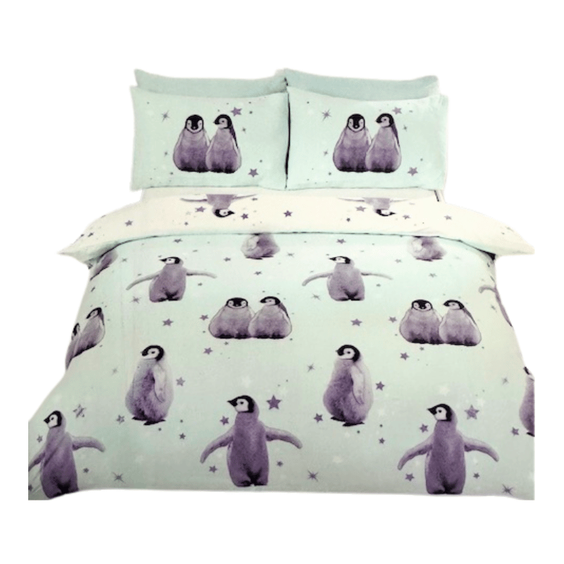 Charming reversible duvet set featuring a playful Starry Penguins Ice design, adding a fun and cosy touch to any bedroom. Soft polycotton fabric offers comfort and durability for everyday use
