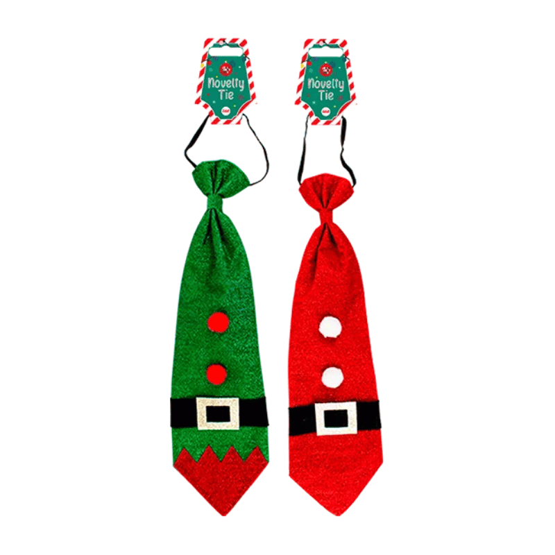 - Christmas Novelty Ties are constructed using a glittered fabric and feature decorative pom pom buttons and an attached decorative belt with a glittered buckle.