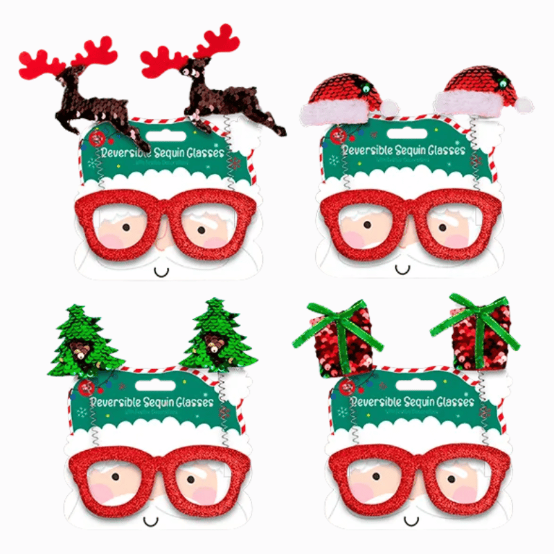Reversible Sequin Christmas Glasses. The glasses are complete with two spring-attached festive boppers that