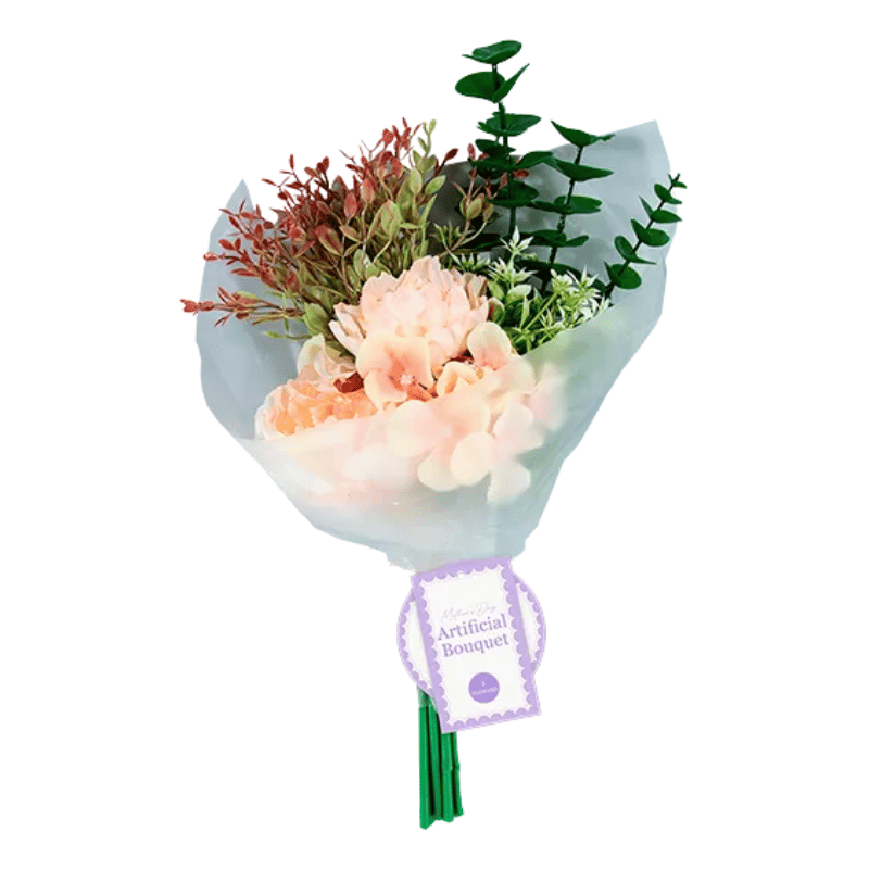Offer a lasting token of appreciation with this Mothers Day Artificial Gift Bouquet, measuring 40cm in length. Crafted from polyester, plastic, elastic, and twine, it features a beautiful arrangement that stays fresh without maintenance.