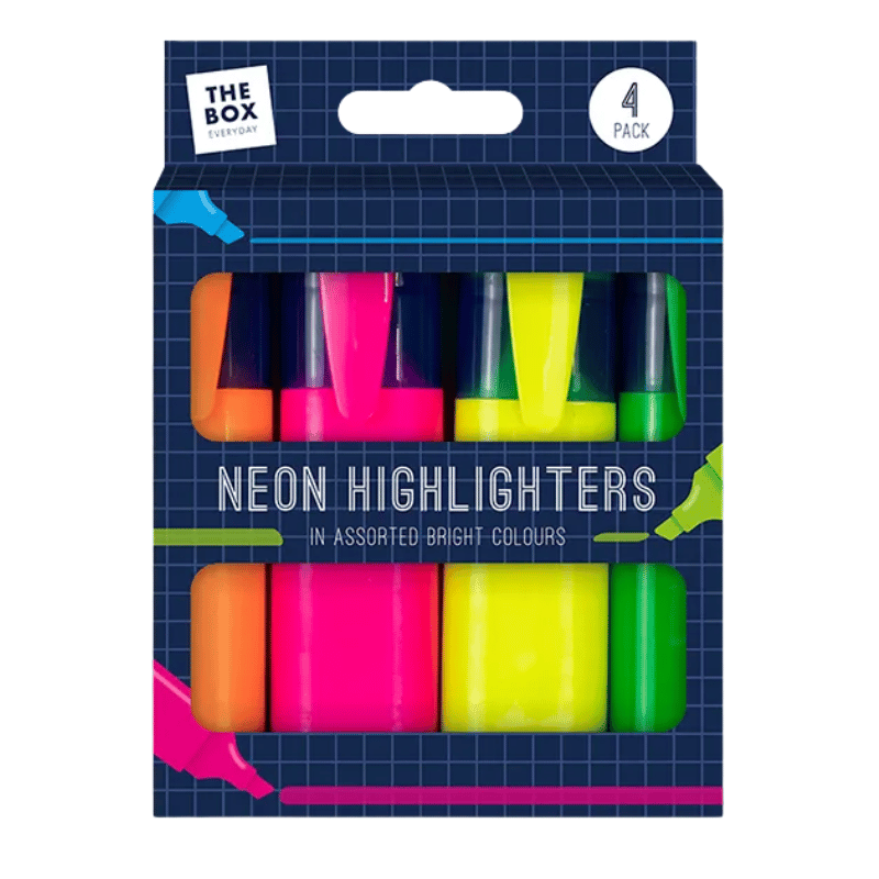 Neon Highlighter Pens 4 Pack Boxed. Neon highlighters are a great everyday essential. The highlighter pens are great for both office and work use.