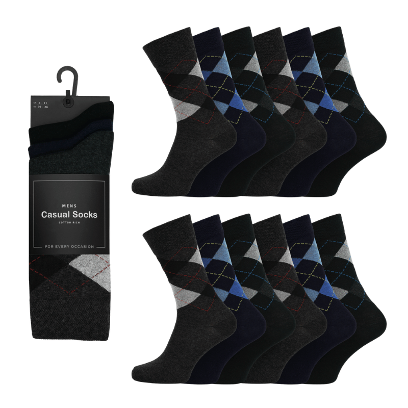 Enjoy everyday comfort with Mens Cotton Rich Casual Socks in dark argyle designs. Designed for sizes 6–11, they provide a comfortable fit with gentle stretch for daily wear.