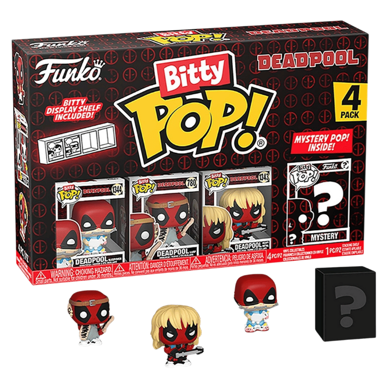 Small in size but big on character, this Funko Bitty POP! Deadpool 4-pack delivers quirky fun with Sleepover, Larp, Heavy Metal, and one surprise mystery figure. Each collectible stands at approximately 2.2 cm, making them ideal for display or gifting.